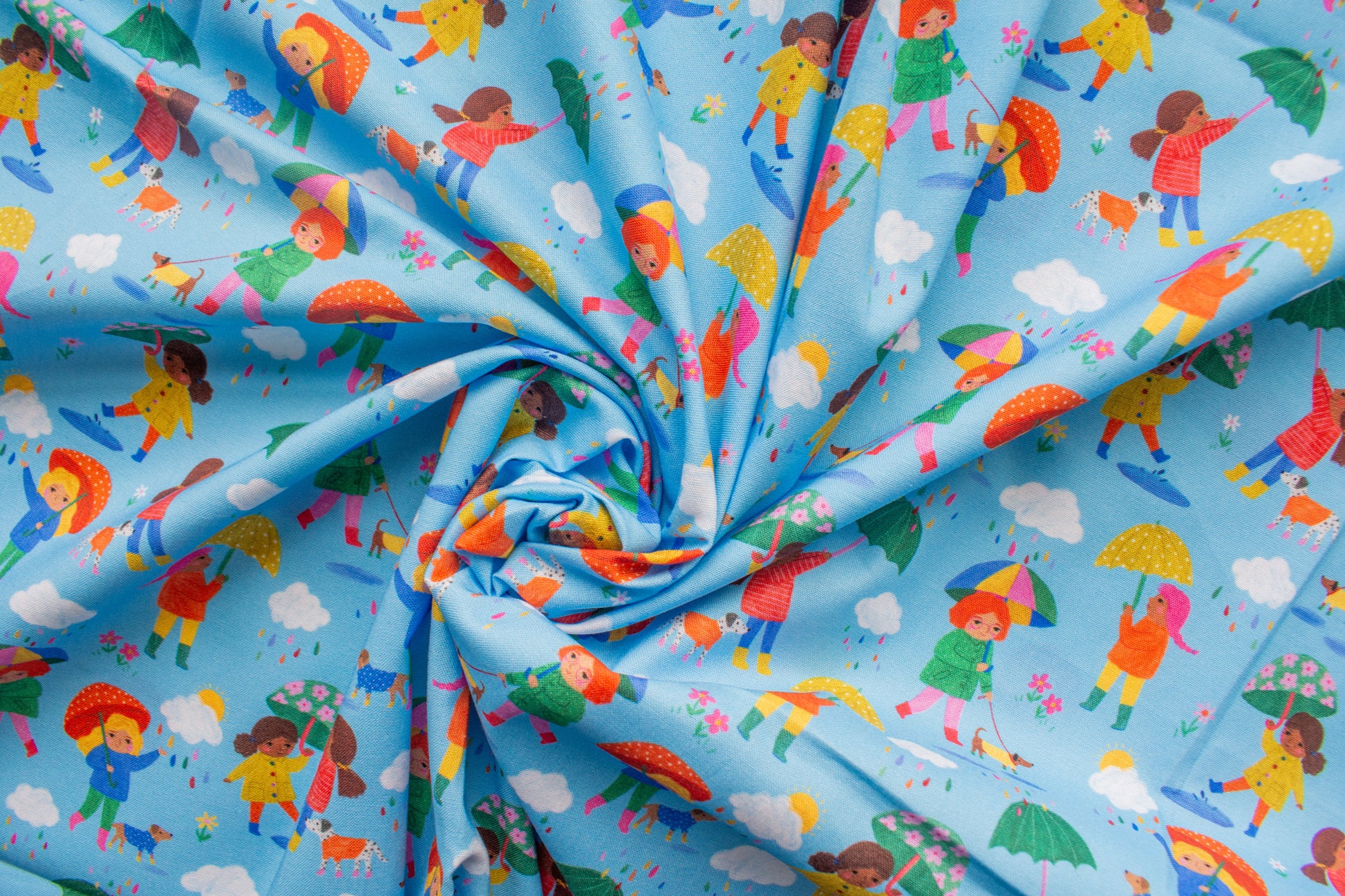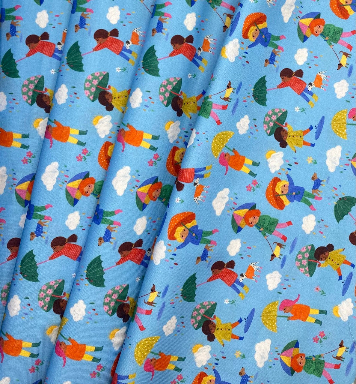 Experience a burst of rainy spring vibes with a vibrant array of colours! Playful droplets, umbrellas, wellies, cats, and dogs!