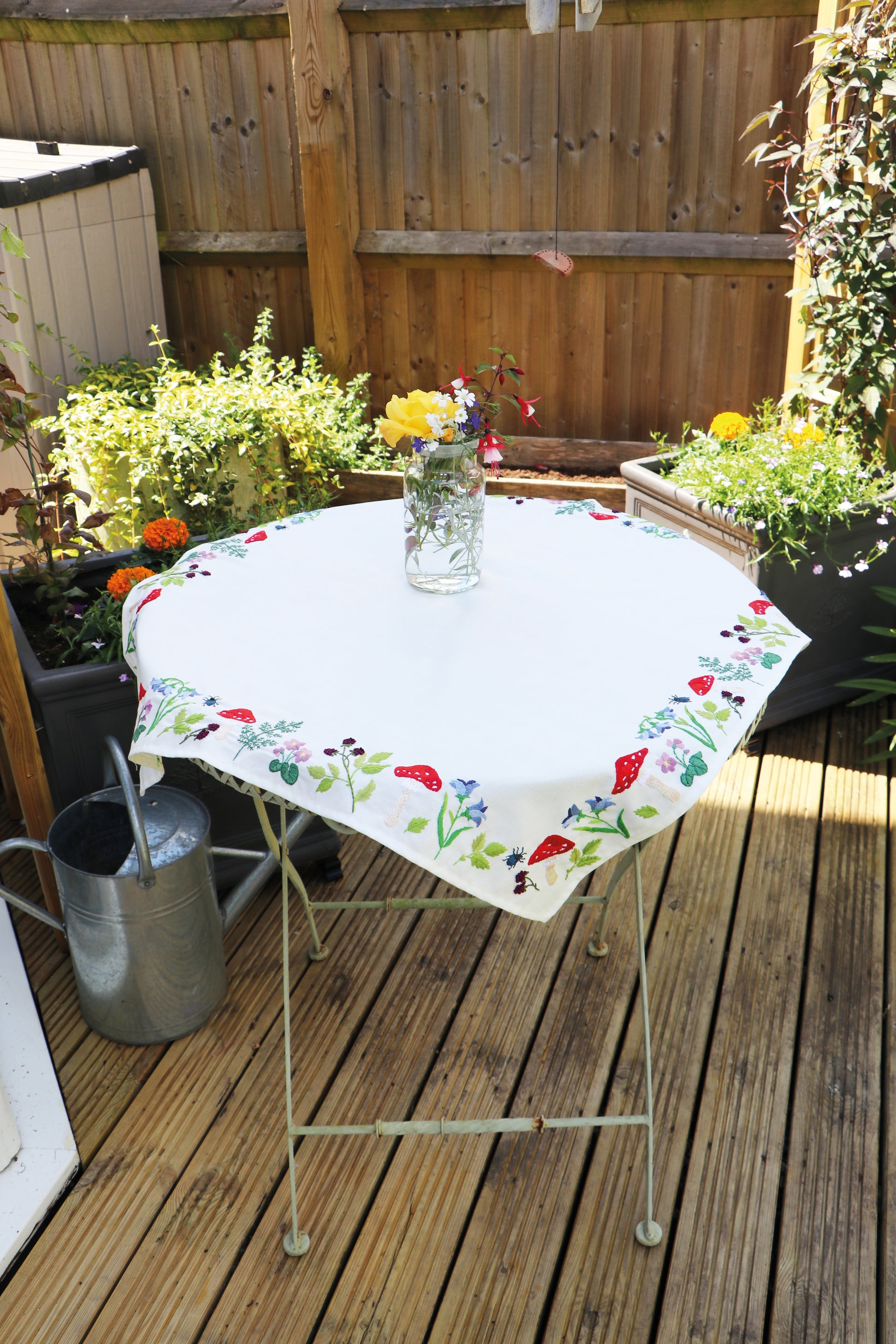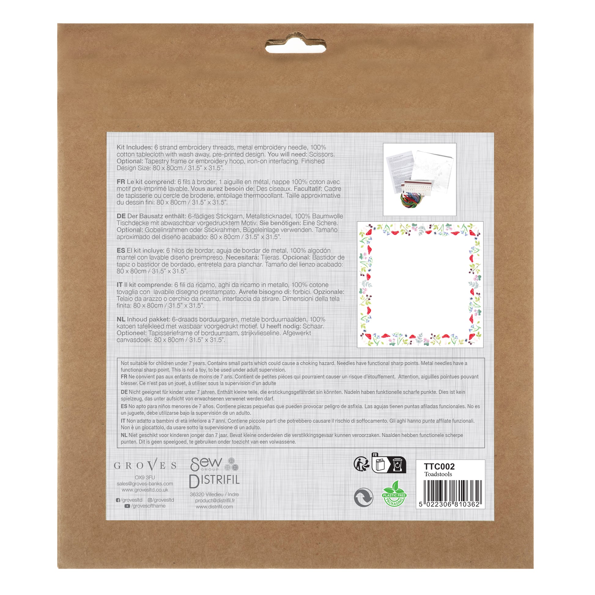 Kit includes: full colour instructions, 6 stranded embroidery threads, 1 x metal embroidery needle, 80 x 80cm pre-printed, premium quality, cotton tablecloth and instructions.